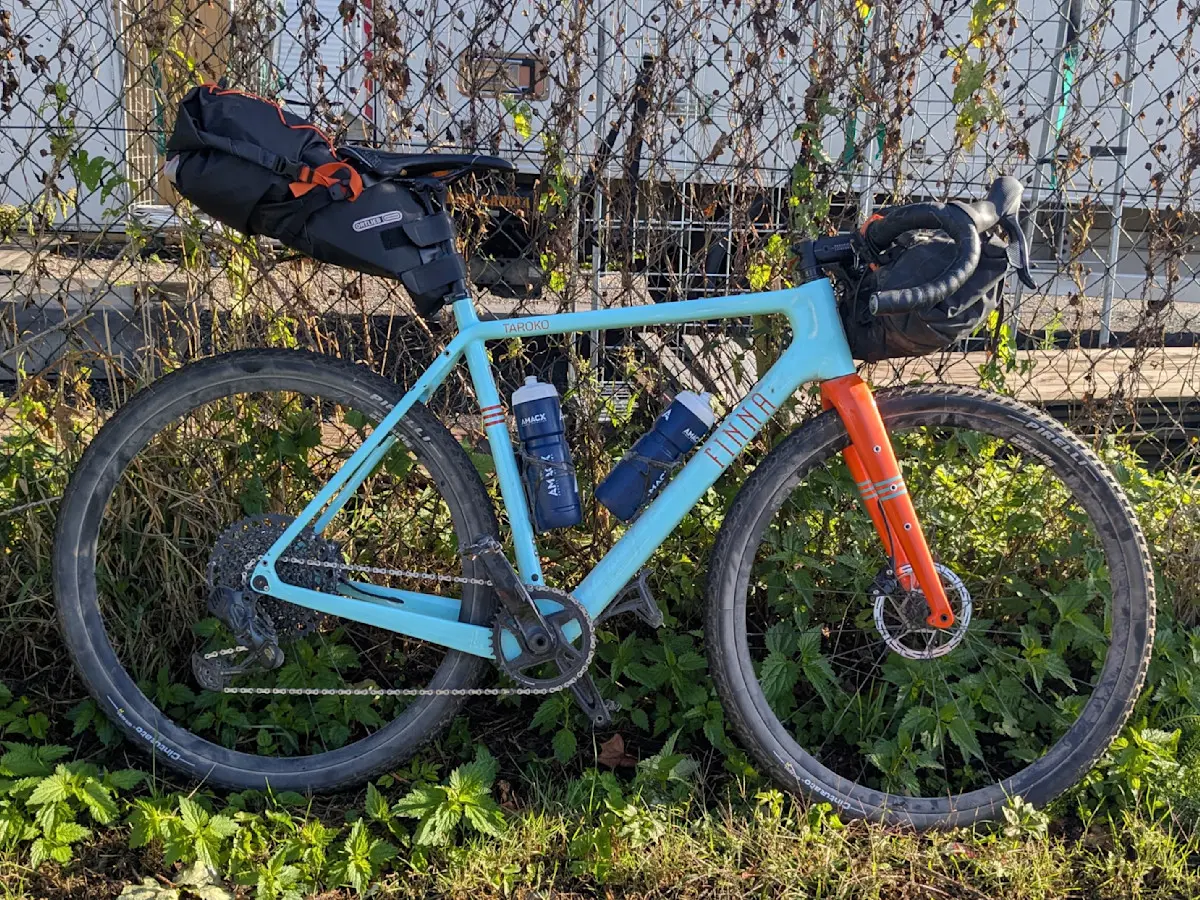 Key items of kit: Mix of Apidura, Restrap and Topeak bags. 44mm Vittoria MEZCAL III gravel tires in classic tube setup, as that's what I am used to. Saddle is a trustworthy Brooks C17 Cambium Carved. My sleeping system is a Tyvek tarp on the ground, a bivvy, a sleeping mat and a sleeping bag.