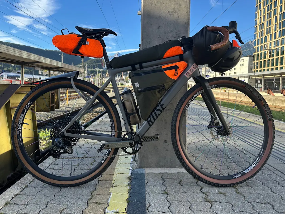 Key items of kit: Bags: Custom Frame and Toptube Bag made by my Marius , Apidura Backcountry 14l Seatbag Electronics: Lezyne Macro 1400+ , ThruNite Th30 Headlamp with two Spare Akkus , Bbb Rear Light, Wahoo Element Bolt v2 Sleeping: Sea to Sunmit Spark2 Sleeping bag and Eatherlight xt Sleeping mat , Sol Bivy