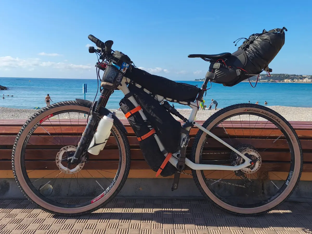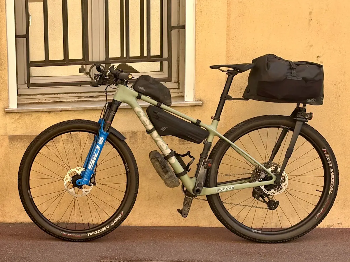 Key items of kit: Bags: Restrap top tube and saddle bag, Revelate Designs frame bag, Tailfin downtube bag, Black Diamond vest, and 2x Blue Lug stem pouches Lights: Lupine SL Nano, Silva Free 1200, Exposure Lights Trace MK3 + TraceR Tech/Power: Coros Dura and Apex, 26,800mAh power bank Sleeping: Sea to Summit Spark 2, Outdoor Research Helium Bivy, and Therm-a-Rest NeoAir X-Lite Clothing: Mostly a mix of Albion and Gore Foodstock: Styrkr gels, rice bars, and carbo-mix Gear Highlights: Freshly serviced fork by Outdoor X, Scope wheelset with Ultradynamico tires, Spirgrips inner bar ends and Excel sheet containing shops, refuges, and other useful resources along the route, including opening hours and more